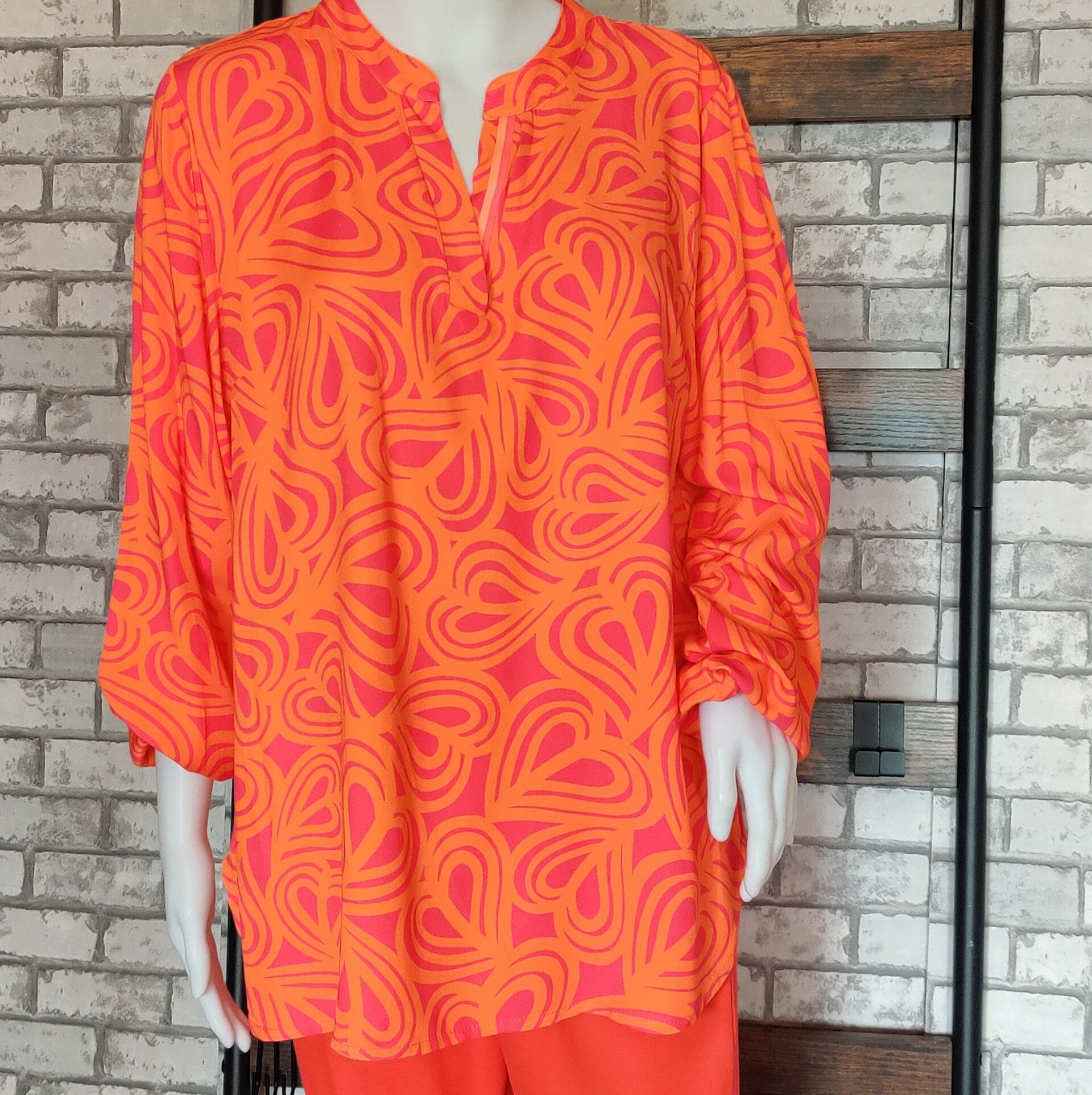 Weiche Bluse mit V-Ausschnitt und kleinen elastischen Bündchen an den Ärmeln, hinten etwas länger als vorne geschnitten. Vielseitig kombinierbar!!!